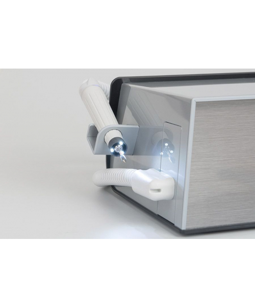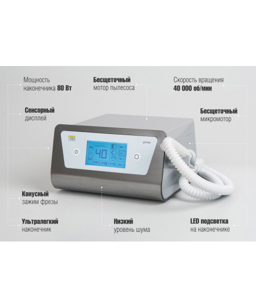 Аппарат оборудован усовершенствованным встроенным пылесосом и эргономичным наконечником со встроенной LED подсветкой с тремя светодиодами. Модель оснащена тремя настраиваемыми ячейками памяти для быстрого перехода к собственным настройкам скорости вращения фрезы и мощности всасывания пылесоса. Все настройки педикюрного аппарата регулируются при помощи сенсорного дисплея на лицевой панели.
